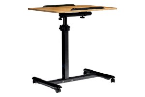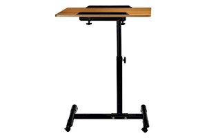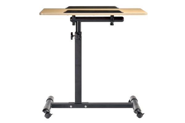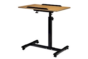 Столик оборудован поворотной столешницей из МДФ и металлическим основанием. Угол поворота столешницы составляет 180°, вплоть до вертикального положения. Высота подъема регулируется в диапазоне от 65 до 97 см. На столешнице имеются ограничители для ноутбука, планшета, предотвращающие падение гаджета.