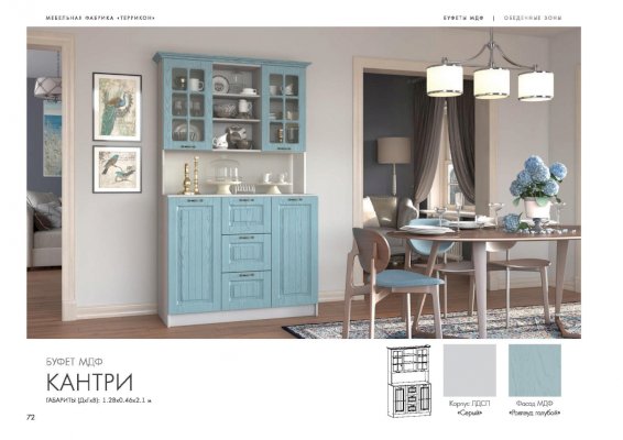 Очарование простой деревенской жизни привносит в дом буфет «Кантри». Отделка нежных холодных оттенков создает атмосферу чистоты и свежести, текстура массива дерева смотрится натурально и дорого. Это очень удобная мебель! В ней предусмотрено место для как нарядных чайных сервизов (на полочках за стеком), так и для обычных кастрюль (в закрытых шкафчиках).