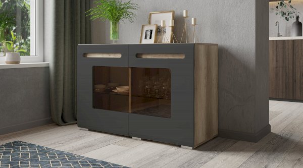 Большой комод Наоми, выполненный в цвете дуб каньон с темными фасадами, может стать привлекательным акцентом любой комнаты. За двумя распашными дверцами, в которые встроены тонированные стекла, расположены полки для хранения посуды или сувениров. А в верхние выдвижные ящики можно положить какие-то мелочи, аксессуары или документы.