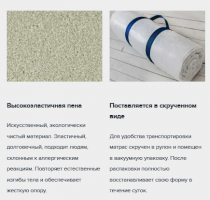 Матрас выполнен на основе монолитного блока из гипоаллергенного, влагоустойчивого и долговечного материала Foam. Благодаря высокой степени упругости обеспечивает идеальный анатомический эффект. Чехол изготавливается из хлопкового жаккарда, простеганного на синтепоне. Благодаря составу чехол хорошо пропускает воздух и сохраняет тепло. Для удобства транспортировки матрас Flex скручен в рулон и помещен в вакуумную упаковку. После распаковки полностью восстанавливает свою форму в течение суток.