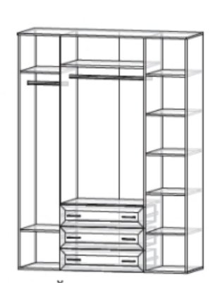 Компактный, но вместительный распашной шкаф с тремя ящиками, за дверью полки для одежды и белья. Вместительные выдвижные ящики полного выдвижения глубиной 400 мм. В двух секциях штанга под одежду.