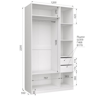 Наполнение: Петли с доводчиками, 2 ящика на шариковых направляющих, полки, штанга
