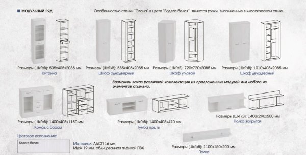 Гостиная «Элана» обязательно покорит любителей минимализма и сторонников практичности, ведь она может комплектоваться по Вашему желанию различными шкафами достаточной вместимости и полками, на которых удобно разместятся и важные мелочи, и элементы декора. Располагаться элементы гостиной «Элана» могут различным образом, что придаст помещению, в котором она будет находиться, неповторимый вид. Дополнительно к основным модулям гостиной «Элана» рекомендуется приобрести полку «Лаго», один из вариантов журнальных столиков, а также добавить романтики в обычный вечер с помощью специальной светодиодной подсветки, которая может быть расположена в стеклянных полках.