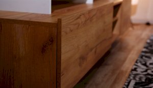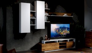 Стенка Невио-2 выполнена с использованием новейшего декора «Дуб крафт золотой» в сочетании с белым - подходит для стилистических направлений лофт, минимализм, скандинавский. Простые формы, естественные природные оттенки создают гармоничную и умиротворенную атмосферу гостиной. Четкая текстура дерева, белый цвет, отсутствие внешней фурнитуры, углубленный цоколь - создают визуальную легкость и компактность стенки. Фасады, выступающие на 1см поверх корпуса, заменяют ручки. Стенку дополняет вместительный комод с витриной. Мебель выполнена из высококачественных экологичных материалов.
