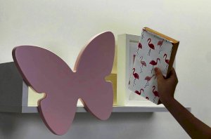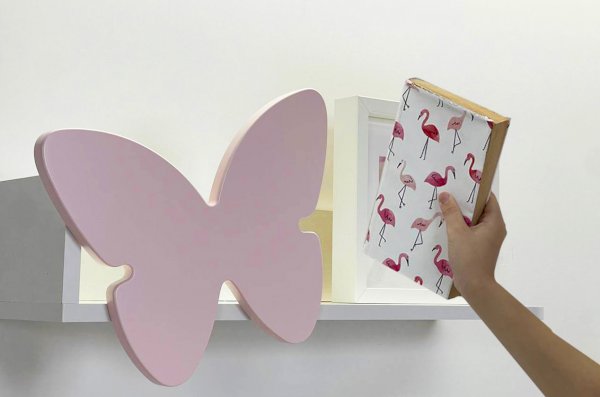 Изготовлена полка из качественных материалов: корпус из лдсп белого дерева придаст интерьеру легкость и свежесть, а декоративный элемент в виде бабочки из мдф розового цвета, эмаль внесет нотку игривости и нежности.