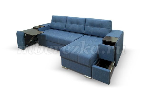 Угловой диван со столиком и выдвижными ящиками в подлокотниках «РИФ» завоевал среди покупателей большую популярность. Такая мебель значительно экономит пространство в помещении и, несомненно, делает отдых на диване комфортнее, ведь буквально под рукой есть раскладной столик в подлокотнике, на который можно поставить бокал, положить книгу или журнал, удобен при работе с ноутбуком. Другой подлокотник оборудован выдвижными полочками для хранения различных вещей. Большой ящик для белья внутри дивана, простой, и надежный механизм трансформации «тик-так» подтверждают функциональность этой модели. Блок независимых пружин, прошивка на сиденье – гарантия длительной эксплуатации дивана.