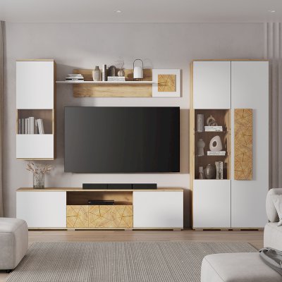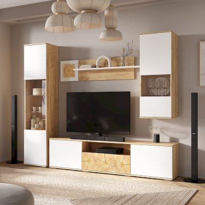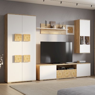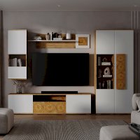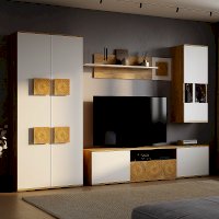 Тумба под ТВ  из коллекции «Тиволи» сочетает три функциональных зоны для хранения: вместительный ящик, открытую узкую полку и еще две просторных полки, скрытых за дверцами. Яркий штрих модели - стильные вставки, стилизованные под спил дерева. Тумба  отлично дополнит гостиную, на ней можно разместить телевизор и приставку, а также небольшую технику и колонку.