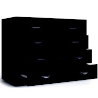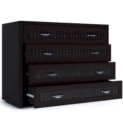 Комод имеет 4 широких (ширина изделия 1050 мм) ящика с декоративными вставками по центру фасадов, которые устанавливаются на телескопические шариковые направляющие полного выдвижения.