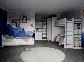 Кровать чердак спроектирована под одно спальное место и может дополняться вторым спальным местом (кровать с ящиками) или рабочим местом (шкаф малый, письменный стол).