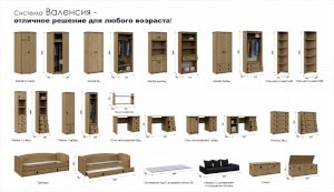 Детская Валенсия - отличное решение для детей любой возрастной категории. Все модули этой системы максимально функциональны и вместительны. Разнообразие модулей позволит Вам подобрать оптимальный комплект. Декоративные элементы создают яркий морской стиль этого комплекта. В этой модели предлагается более компактное решение двуспальной кровати, чем многоярусная кровать, съедающая слишком много пространства. При этом есть возможность превратить кровать в диван. Жемчужина модели – сундук. При относительно демократичной цене в комплекте использованы высококачественные материалы.
