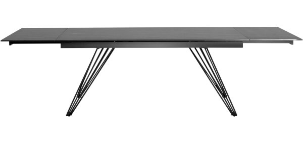 Стильный в сдержанным образе раскладной стол станет прекрасным дополнением для кухни и обеденной зоны. Столешница из темной керамики устойчива к повреждениям и истиранию, долговечный материал с прочной текстурой. По бокам стола расположены дополнительные раздвижные элементы, которые увеличивают полезную площадь столешницы. Металлический каркас лаконично вписывается в образ за счет оригинальных ножек из нескольких линий. Основание оснащено заглушками, которые не позволяют металлическим частям соприкасаться с полом и портить покрытие при перемещении.