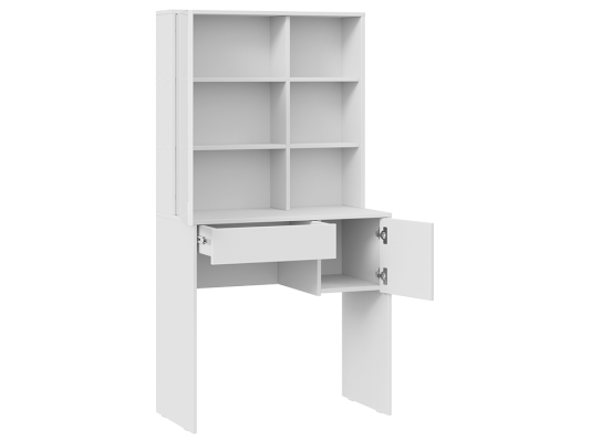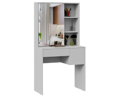 Помимо внешней привлекательности стол имеет большое зеркало, за которым размещены скрытые полки для хранения всех необходимых аксессуаров и косметики. Наличие открытых полок позволит установить предметы декора, а практичный выдвижной ящик и секция за распашной дверцей добавит места для необходимых мелочей. В этом туалетном столике нет ничего лишнего, только самое необходимое для уголка женской красоты.