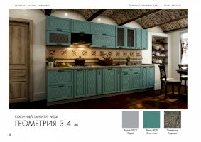Набор кухонной мебели «Геометрия» получил свое название благодаря оригинальному дизайну. Дело в том, что его фасады украшены незатейливыми симметричными узорами, состоящими из небольших ромбов. Также комплекту присущи симметрия и простота форм. У покупателей есть возможность выбирать цветовое решение: в ассортименте изделия оттенков топаз, тирамису, гранат, алмонд.