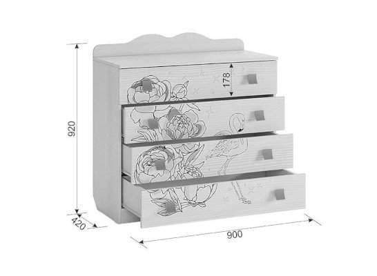 Стильный и модный комод детской «Фэнтези» - обрадует каждого ребенка. В 4 удобных выдвижных ящиках разместятся все необходимые вещи. Необычный принтерный рисунок на фасадах выдержан в общем стилистическом решении. Рисунок устойчив к истиранию и ультрафиолету.
